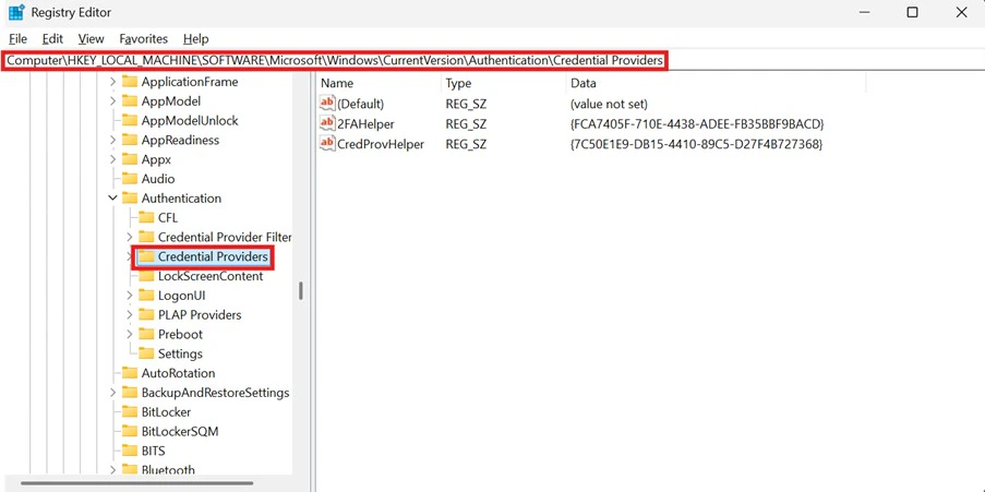 - In the Registry Editor, go to the following path: HKEY_LOCAL_MACHINE\Software\Microsoft\Windows\CurrentVersion\Authentication\Credential Providers.