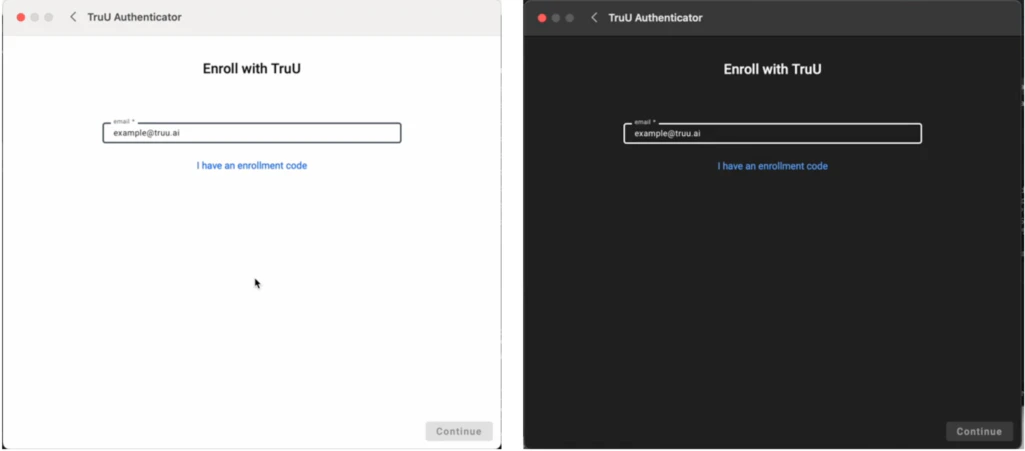 - When enrolling in TruU the Authenticator will now honor the Appearance setting in macOS for the Mac Authenticator for all screens including the enrollment screen that had previously only supported a dark appearance.