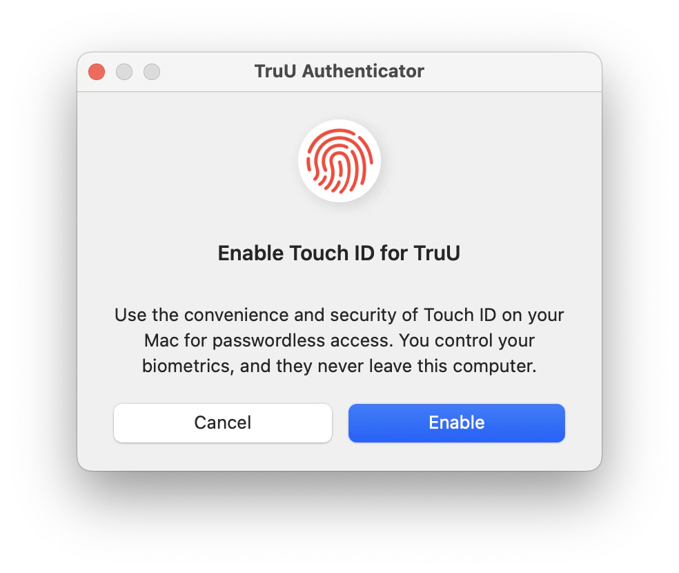 - Users can now select if they want to allow TruU to use Touch ID when authenticating to SSO applications. If Touch ID has not been setup by the user, they will be directed to System Settings to add their fingerprints. Use of Touch ID for unlocking the screen or for authentication prompts from the OS are controlled by macOS and are not changed by enabling/disabling Touch ID for TruU.