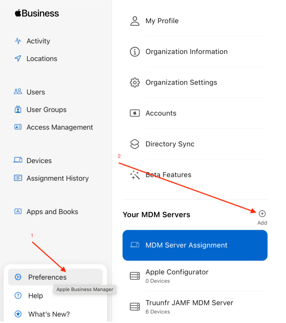 Step 1: Sign In https://business.apple.com Step 2: Go to Preferences to add New MDM Server