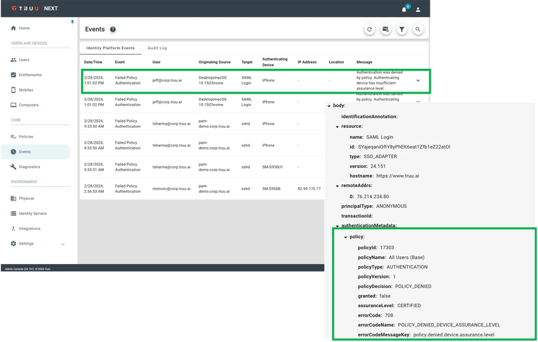 - We are pleased to announce that we have further improved our event data to give better insight into failure events. Specifically, we have added a new failure Event Type for “Failed Policy Authentication”. This will give better insight into access failures due to a user not being able to satisfy a policy requirement. For example, if you require users to authenticate with a device using an assurance level of “Certified” but the user attempts to access the resource with a device with the assurance level of “Basic”, that event would be captured and visible in the Admin Console as shown below.