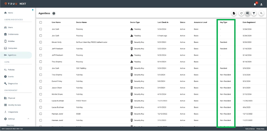 - In addition, regardless how you choose to migrate keys, when migration is enabled the Agentless table includes a new column for “Key Type” showing which keys are “Resident” and which are “Non-Resident”. This provides the visibility needed to help Admins decide at which point to disable the migration and always use the resident key authentication flow where users do not need to provide a user identifier to authenticate with a security key. Agentless data can be sent to Admins for sorting and analysis.