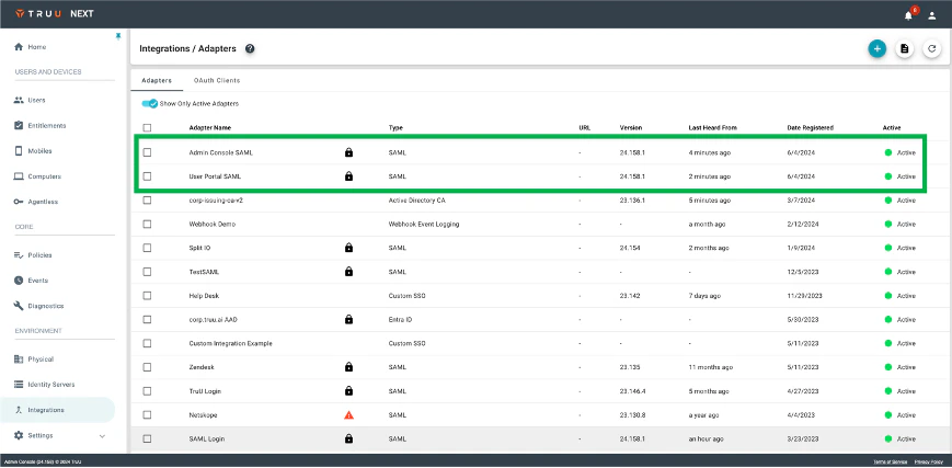 - With this feature enabled we create 2 new SAML adapters: one for the User Portal and a second for the Admin Console. These adapters have limited configuration options – only the FIDO origin and the default view can be set as all other configurations are handled by TruU.