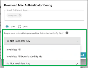 - Whenever an Admin downloads a Config File for the Windows or Mac Authenticator, a new OAuth client is created that allows the config file to be used to enroll the authenticators. These OAuth clients can be set to inactive to prevent the clients form being used for future enrollments. However, Admins need to remember to invalidate the old clients to prevent further usage when new config files are created. With this release, Admins are presented with choices to invalidate previously downloaded config files.