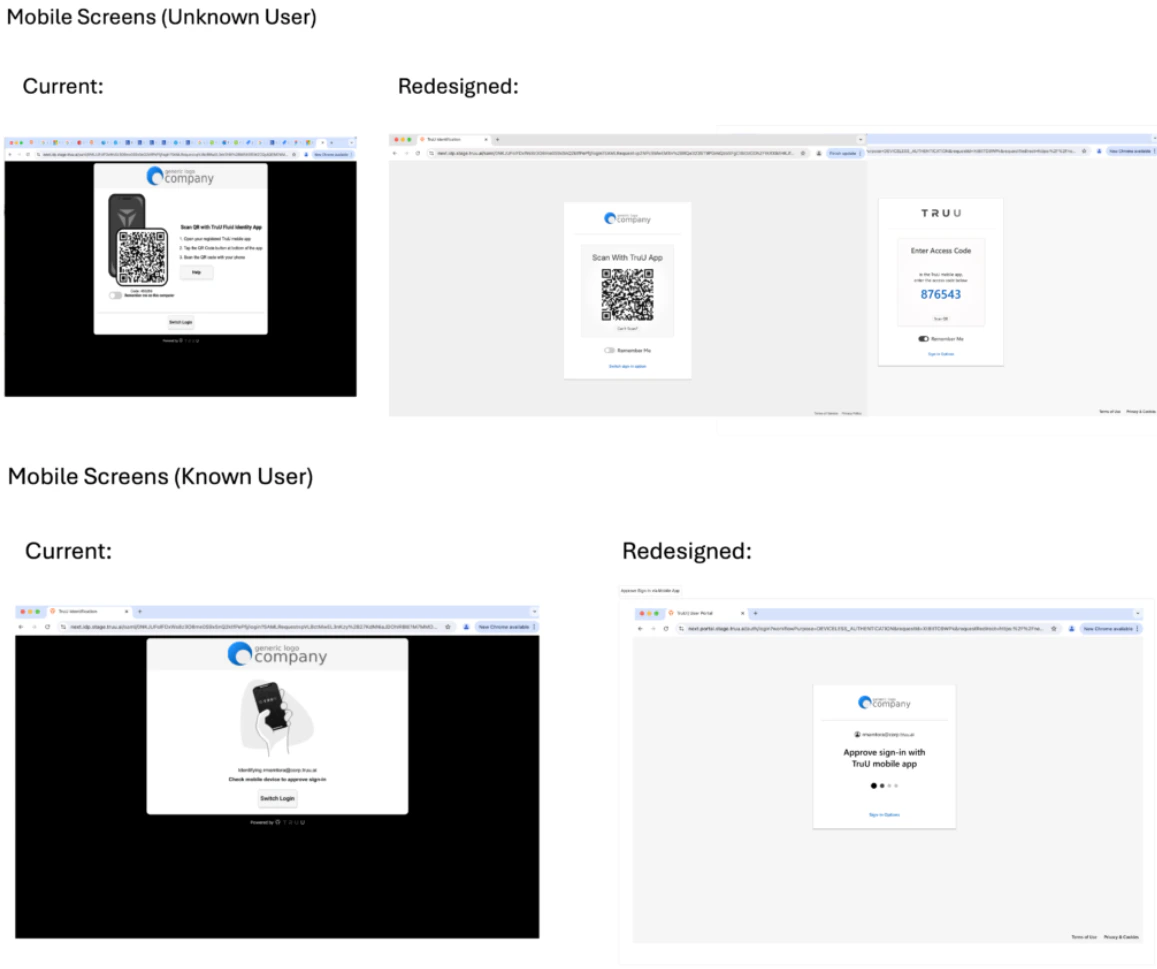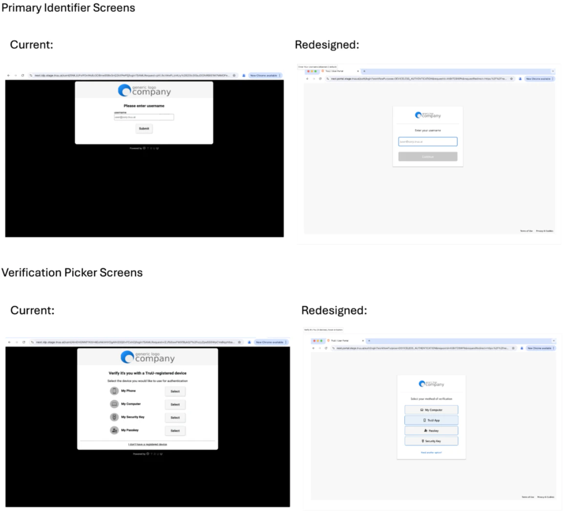 - We have completely redesigned the screens we show for SSO to be much more streamlined and consistent across pages / interfaces. The new UI ensures that the main part of the UI (the white box with all the user instructions and interactions) appears in the same position on the screen. While those boxes may have different heights based on the real estate needed for the screen, the width does not change. In addition, we have removed the excessive TruU branding from those screens. In fact, if you have customized the SSO pages to include your logo, we no longer show the ”Powered by TruU” below the white box. In addition, we have added links to the Terms of Service and Privacy Policy to the SSO pages as well.