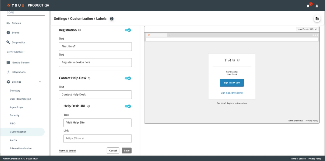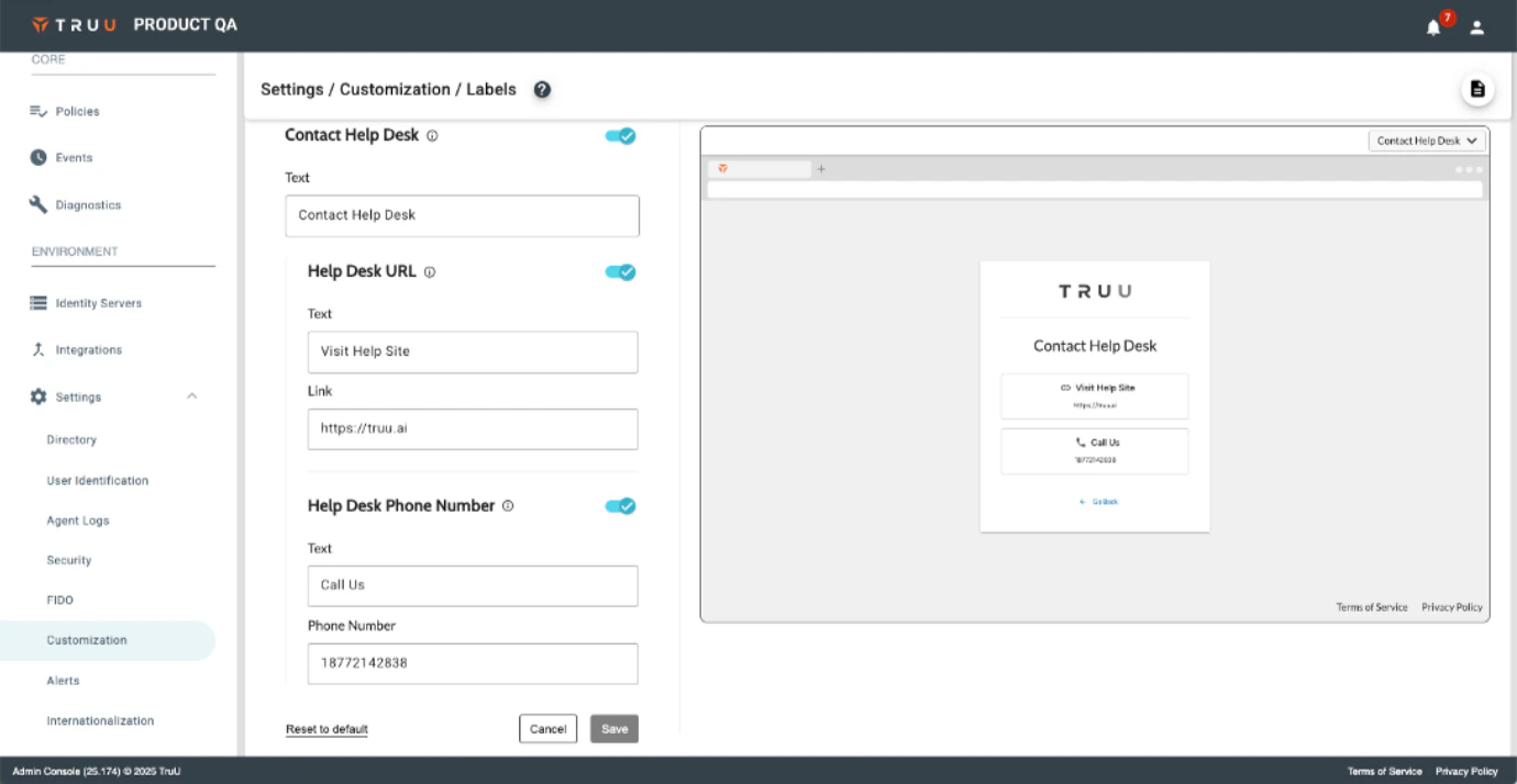- Customers have asked for a way to provide Help Desk contact information when a user encounters an error that requires assistance from the Help Desk. We now provide an option to enable this through the Settings>Customization>Labels menu in a new “Contact Help Desk” section. When this is enabled, whenever a user encounters a TruU error in their browser that suggests to contact the Help Desk, you can now provide contact info for your Help Desk (phone and/or URL).