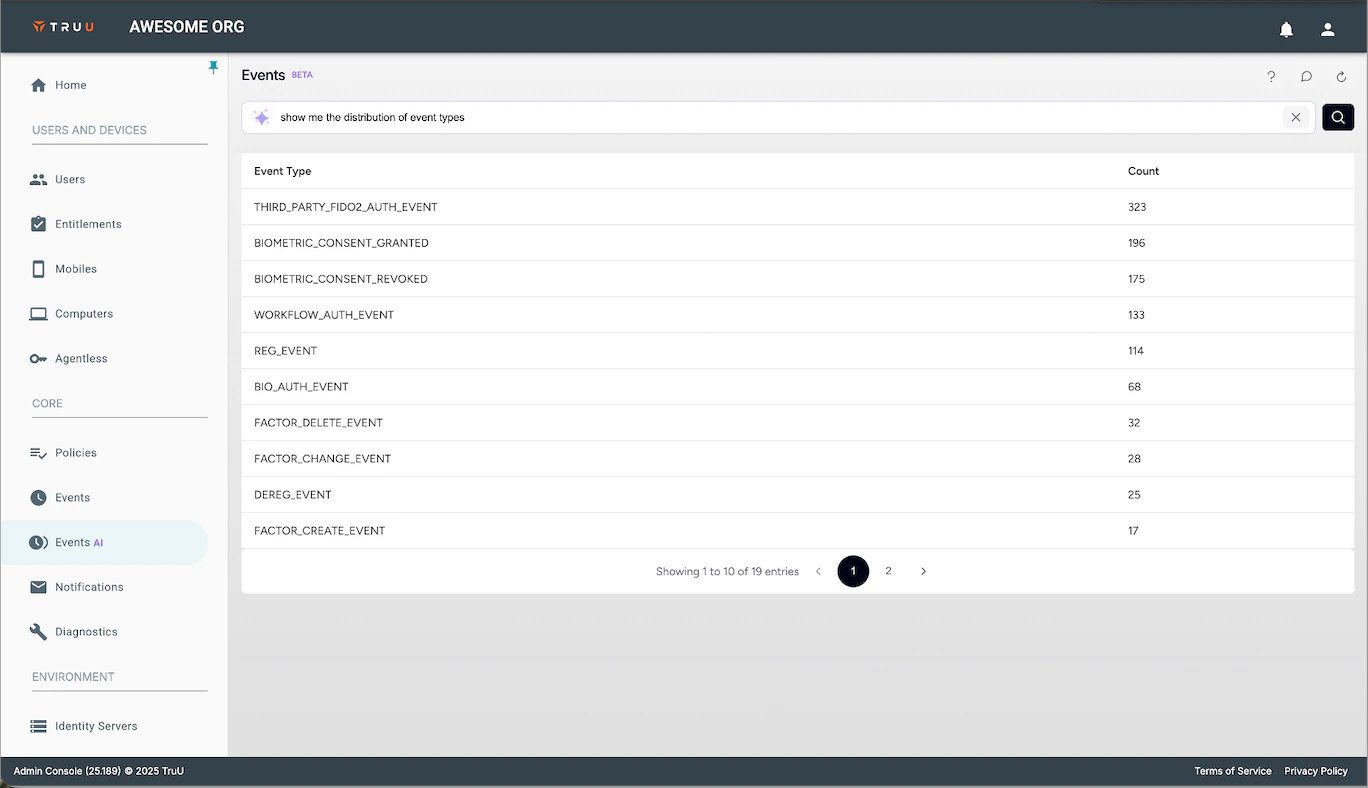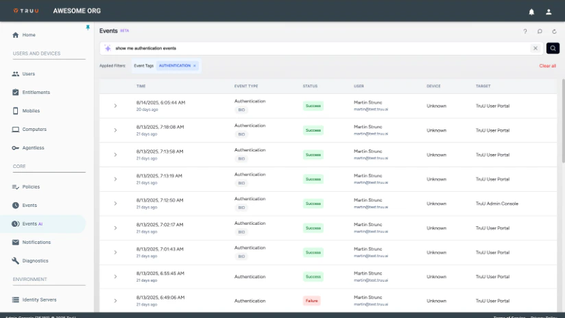 Search and Filtering: can be done using a combination of natural language search (e.g. “how many authentication failures were there in San Jose today?”, “Show me any time a user used biometrics”, or “show me all Registrations in the past week“, etc.), and clicking on “filter” links that are displayed in the table (e.g. user names, statuses, etc.).
