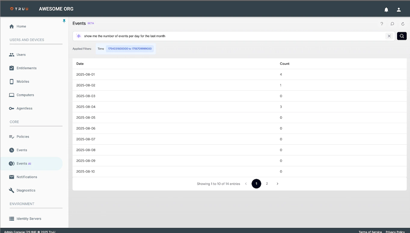 We are very excited about our new AI-powered natural language search and updated Event UI. This feature is being made available for all customers as a beta and will be available alongside the existing Events interface. There are still a few features missing from the new event search such as reports download. These missing features will be included in future releases.