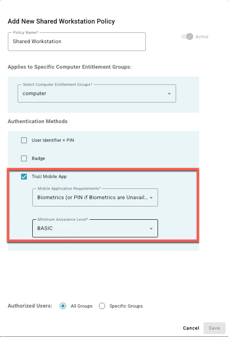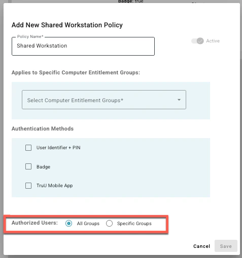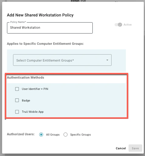 - Shared Workstation Policy: Defines the actual login experience and specifies which authentication factors are allowed on the hardware, such as badges, mobile app scans, or PINs.
