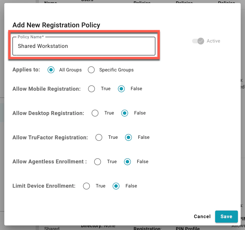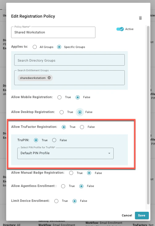 - Set to True to permit registration of TruU cloud-managed factors. For Shared Workstation scenarios, this enables the cloud-based TruPIN factor.