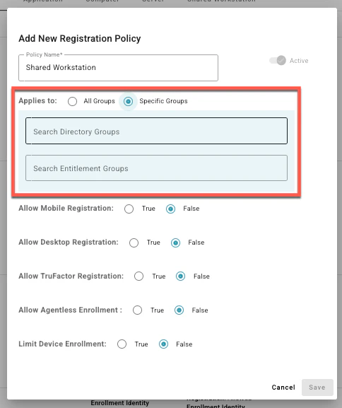 Shared Workstation policies apply to Computer Entitlement Groups (at least one must be selected). The following policies can be set for Shared Workstations:- In the TruU admin console, navigate to Policies > Registration and click the blue plus icon: