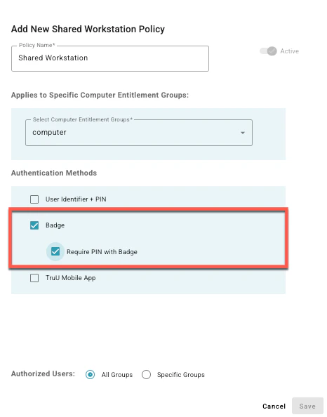 - Require PIN with Badge: when this option is selected, users will need to enter their TruPIN as a second factor to sign-in to the Shared Workstation.