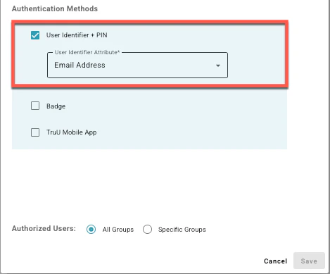 - User Identifier + PIN: When this is selected, users will need to enter a user identifier (e.g. UPN) and a TruPIN to sign-in. (NOTE: a TruPIN is a cloud-based PIN that users can setup in the User Portal. If you would like to use this option, be sure to enable this option for your users using the following guide Policies