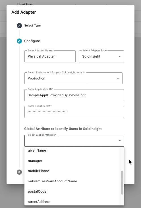 - Next, under the “Select Adapter Type” dropdown menu, select SoloInsight. Name your Adapter as well. Additionally, as SoloInsight handles the provisioning of virtual badge credentials, they will be providing either Production or Sandbox credentials to complete the configuration (the communication from TruU to the CG Cloud). The Application ID and Client Secret will be provided by the SoloInsight team. Lastly, under the Select Global Attribute section, select the Identifier that you wish to use for provisioning.