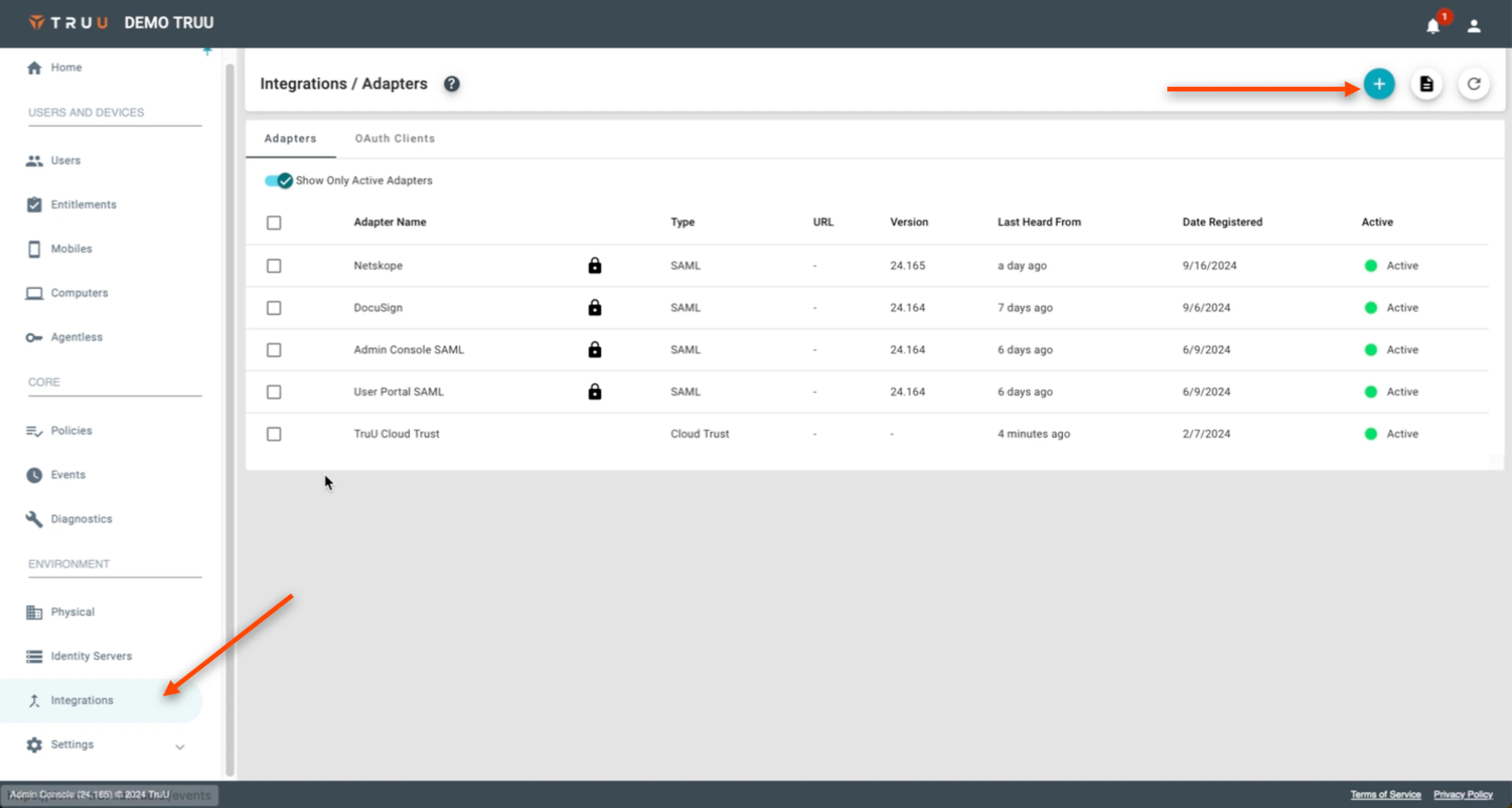 - On the TruU Admin Console, navigate to the “Integrations” tab, then hit the blue (+) to “Add a New Adapter”