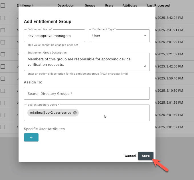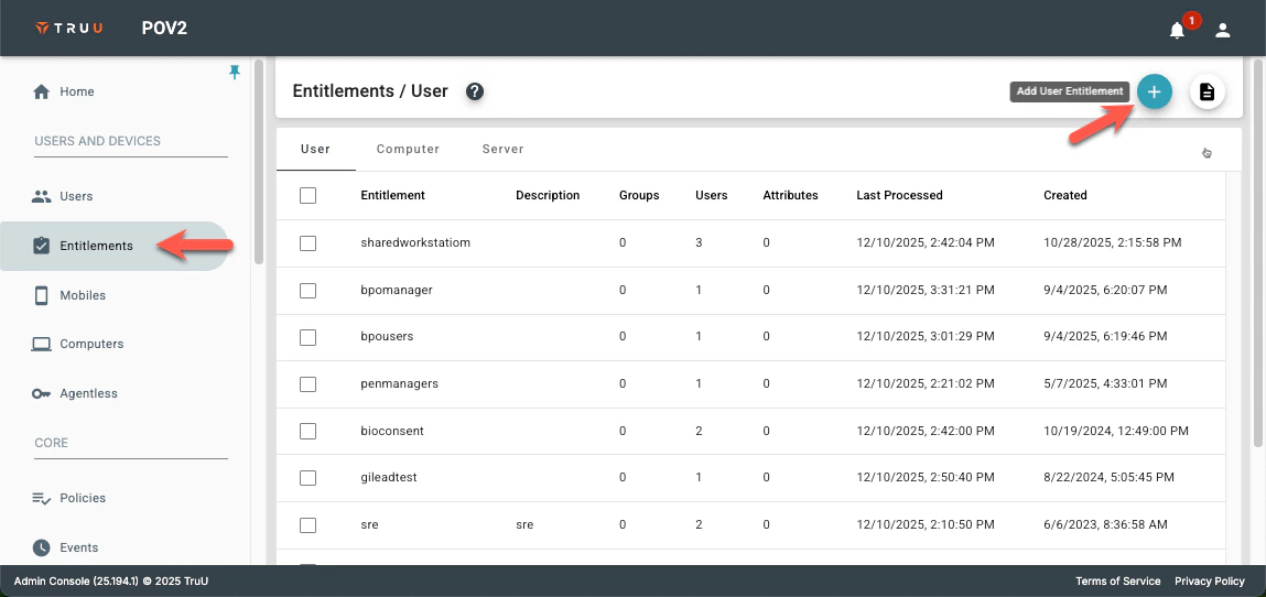 - In the TruU Admin Console, navigate to Entitlement Groups and Click Add User Entitlement.