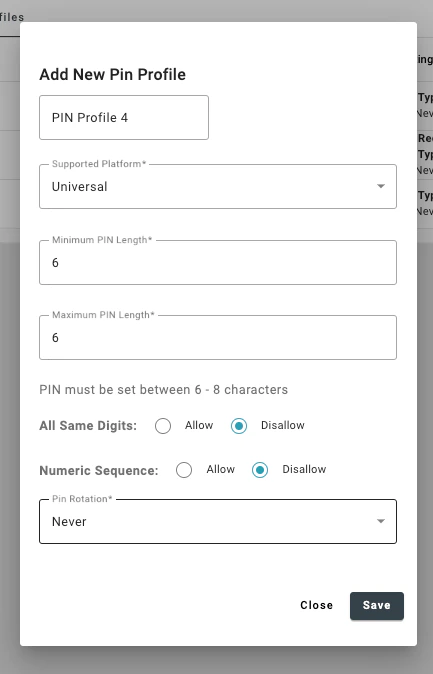 - Platform Specification: The profile can be set to apply universally or to specific platforms. Minimum and Maximum Length: Admins can specify the minimum and maximum PIN lengths, with flexibility between 6 and 8 characters.