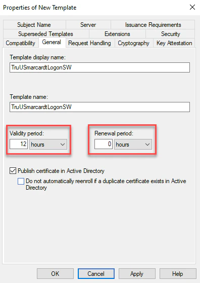 In the General tab, specify the template validity and renewal period. TruU recommends: