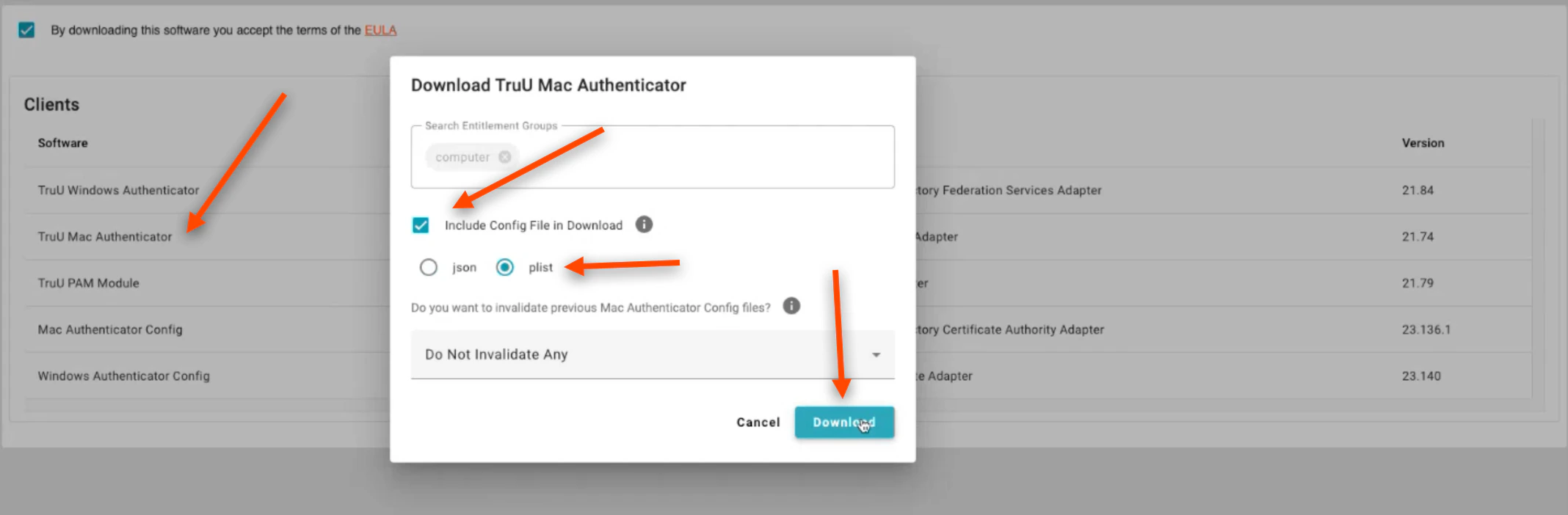 Download the TruU Mac Authenticator. Click the box to Include Config File in Download. Click plist, then click Download