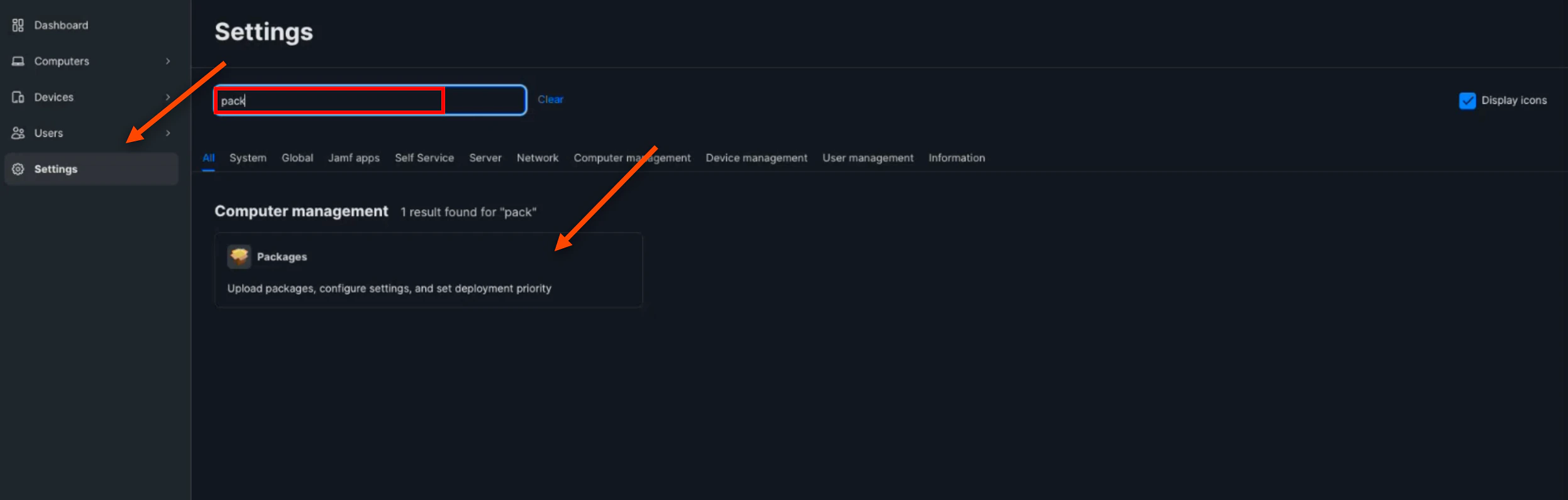 Next, navigate back to the “Settings” tab and search Packages. Click on the Package