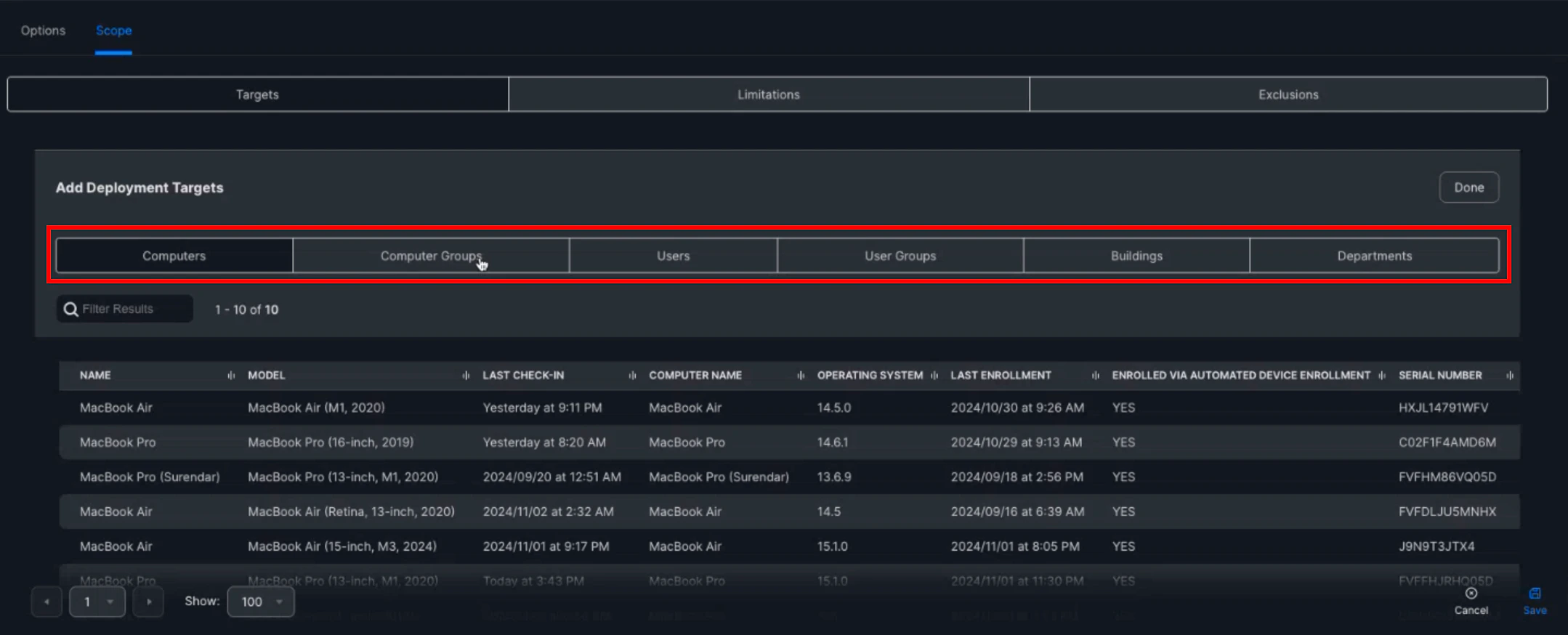 Click the Scope tab, select Specific Computers, then click (+) Add
