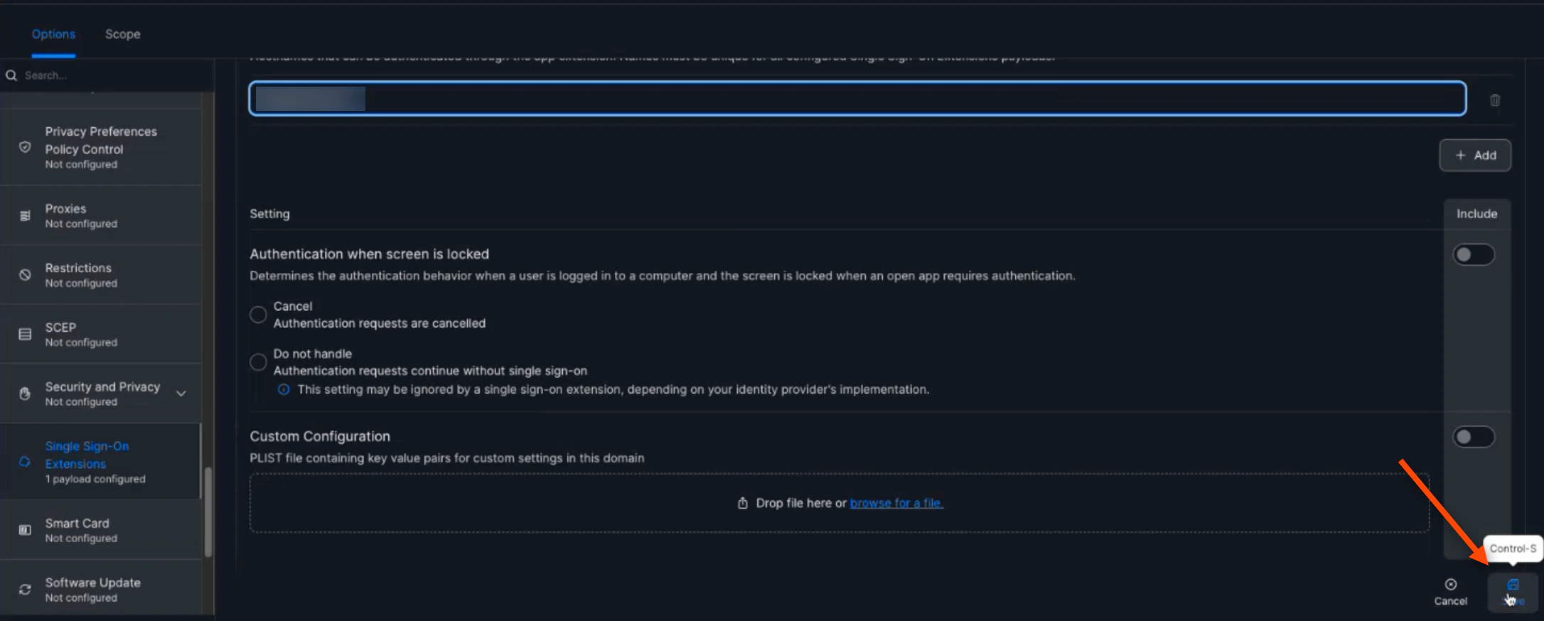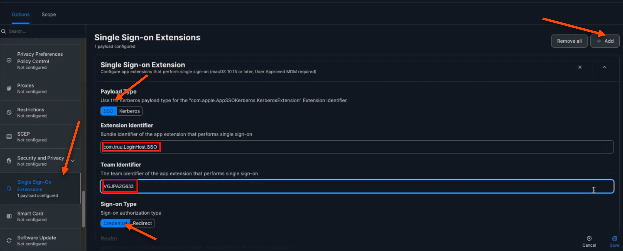 Then, scroll down and select Single Sign-On Extensions. Click (+) Add. Select SSO for the Payload Type. Then, enter com.truu.LoginHost.SSO for the “Extension Identifier”. Next, enter VGJPA2G633 for the “Team Identifier”. Then, ensure that the “Sign-On Type” is Credential