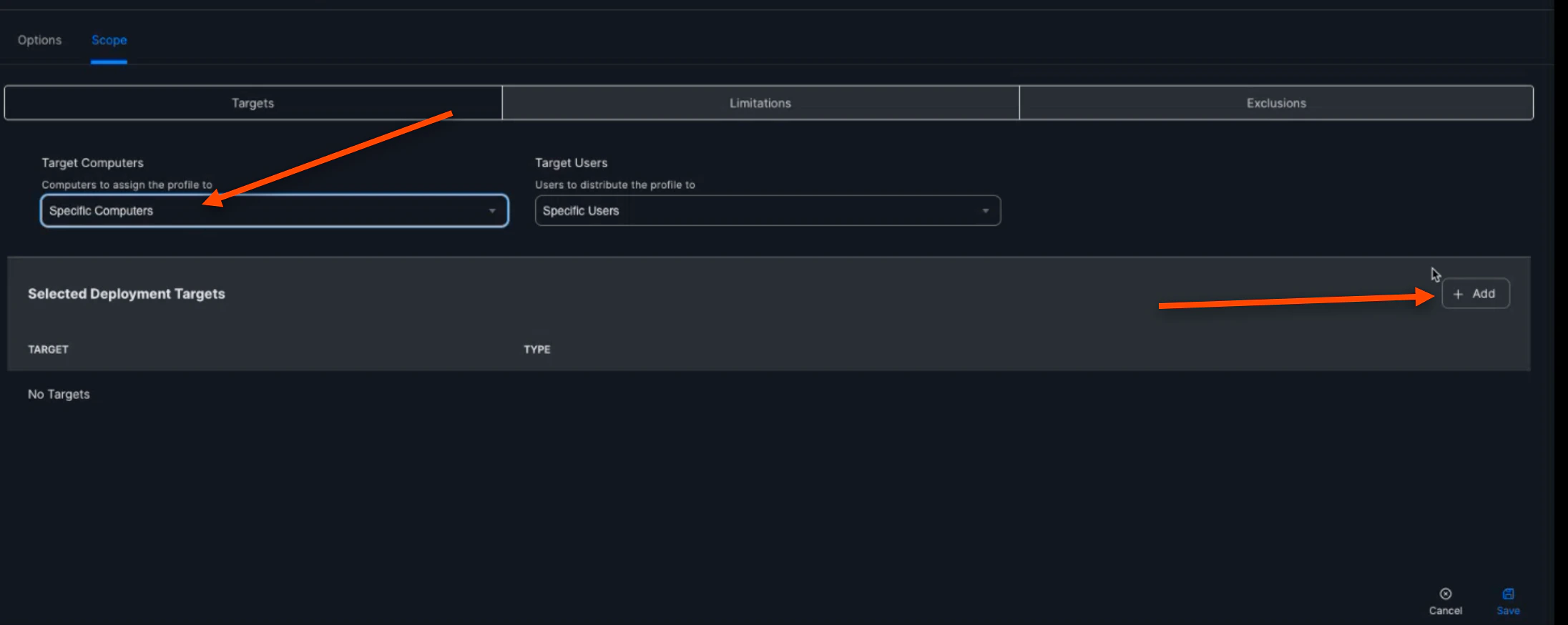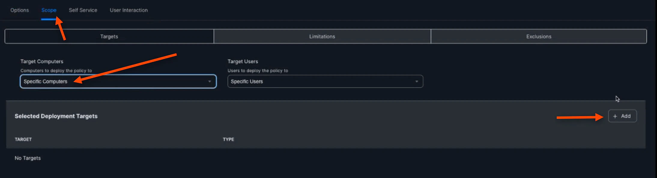 Select Specific Computers for the “Target Computers”, then click (+) Add