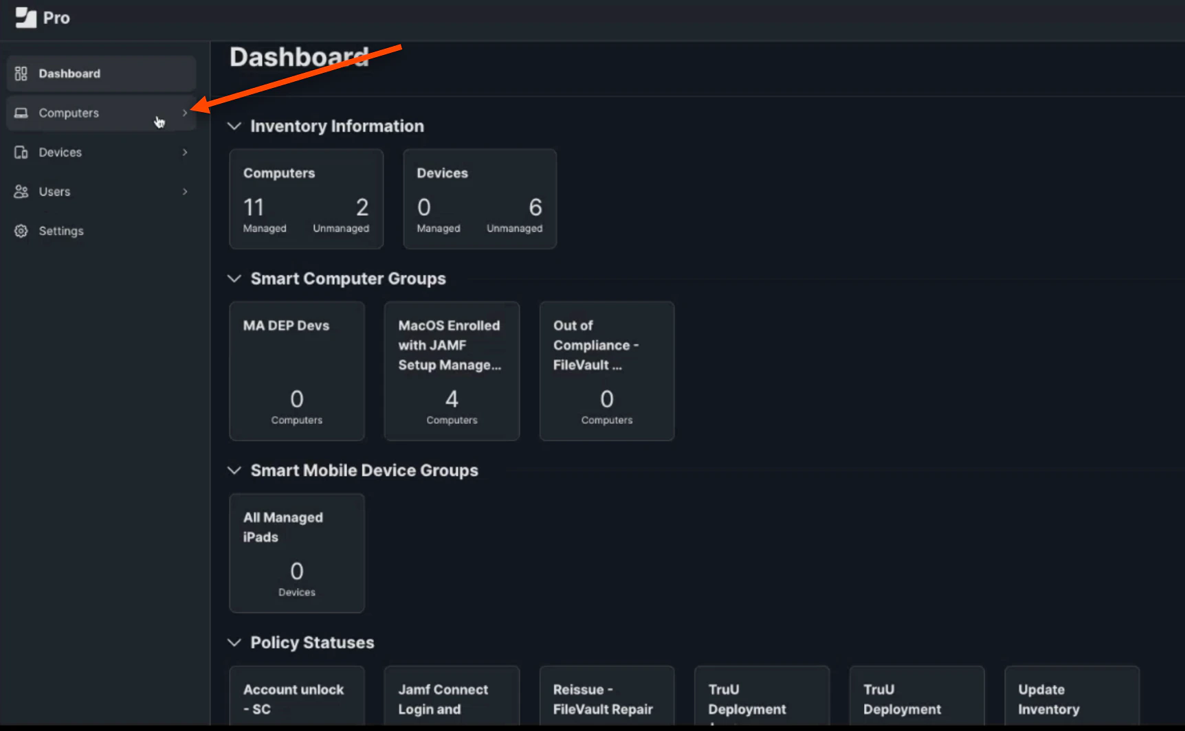 Login to your JAMF Admin Portal. This first step is creating a deployment profile. First, click Computers on the JAMF Dashboard