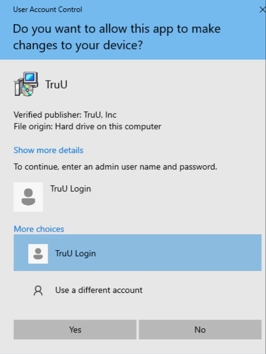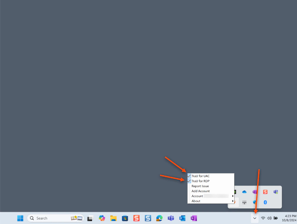 - Navigate to the “Down Arrow” icon on the bottom right corner of your screen. Then, click the TruU icon. Here, you can see the two options as to what features - whether it be RDP or UAC - you wish to use