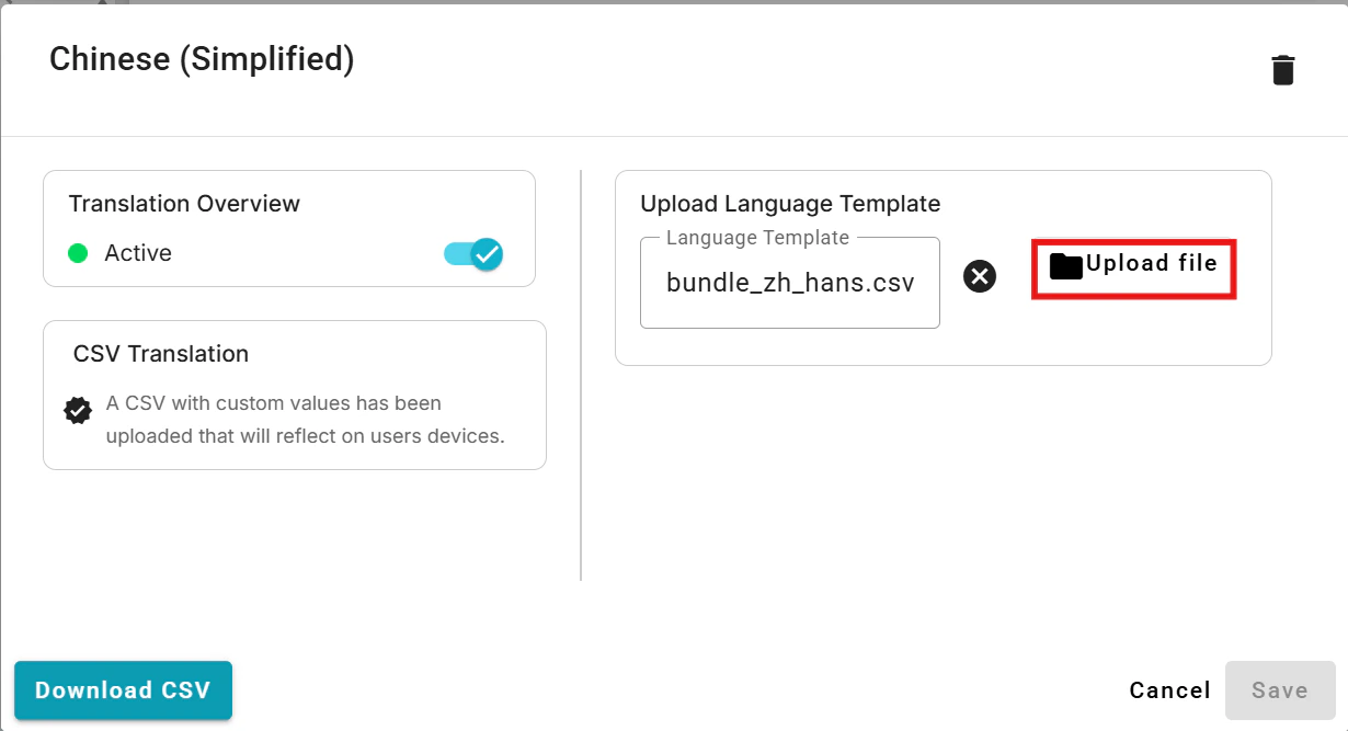 - Now, click on the row for the desired language (the one you exported the template for), and upload the corresponding CSV file.