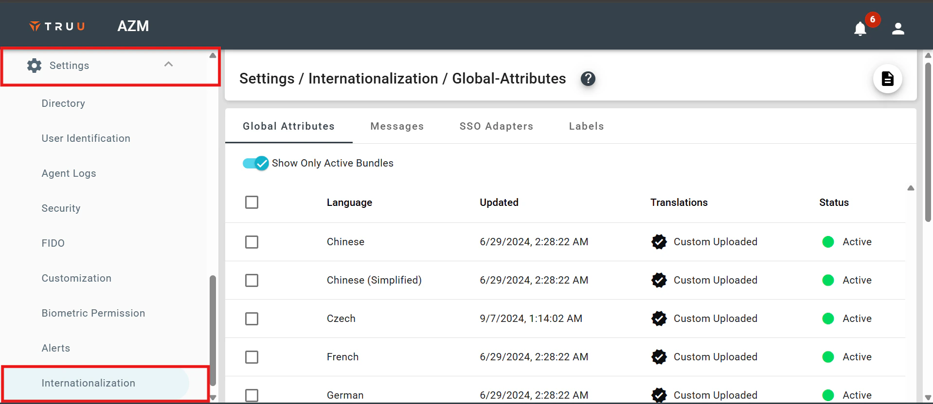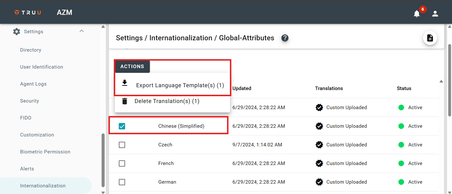 - To localize the language, log in to the TruU Admin console, open the settings dropdown, and select Internationalization.