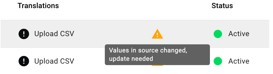 - If the source content is updated after translations have been provided, a warning indicator will appear in the table to notify you that the source content has been modified.