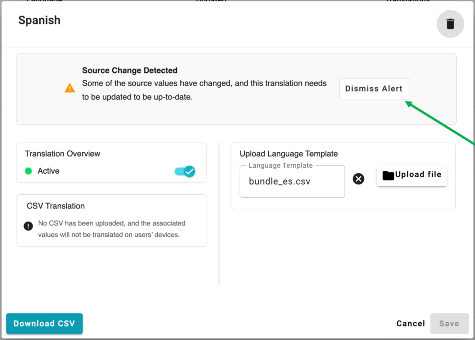 - Downloading the CSV, updating the text as needed, and re-uploading the CSV