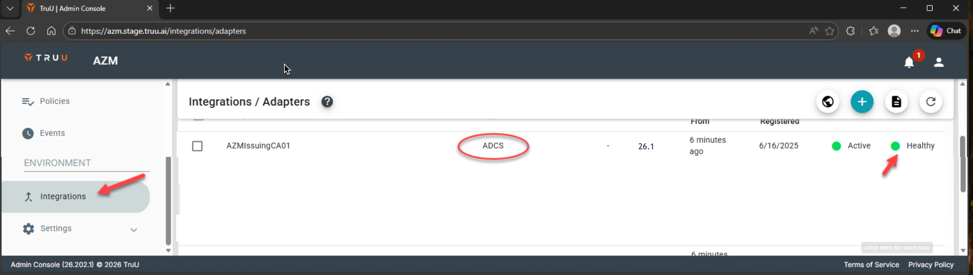 - In your TruU Admin Console, Go toIntegrations > Adapters to confirm that the updated adapter isHealthy.