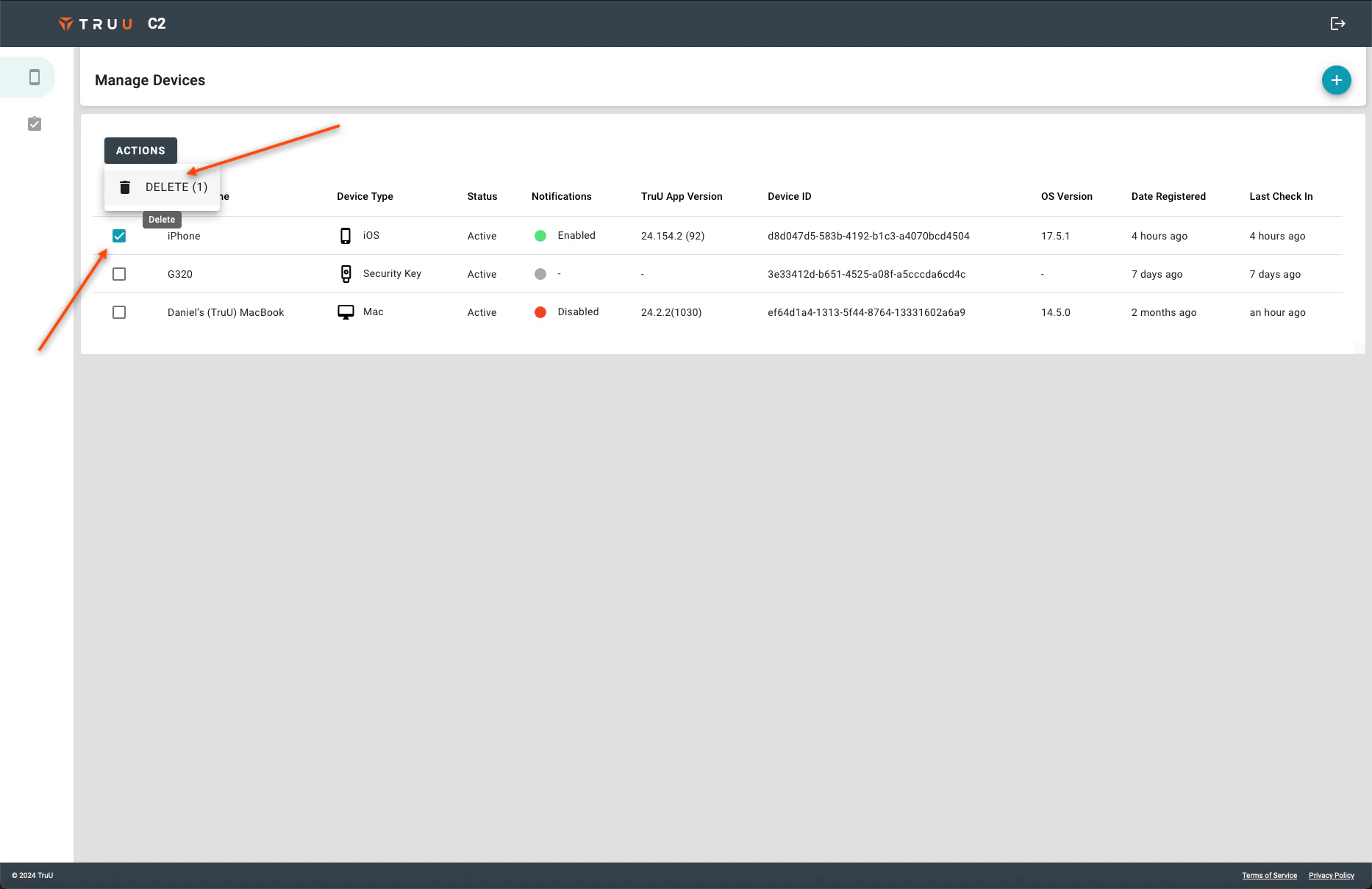 - Navigate to the “Manage Devices” tab, select the device you wish to delete, click Actions, and select Delete.