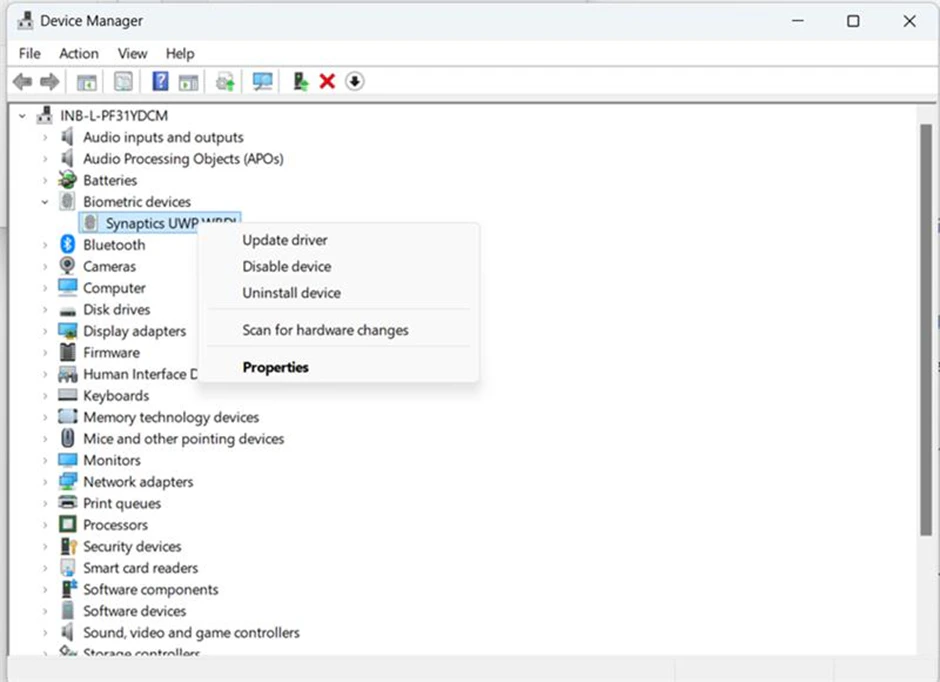 - Right-click on the biometric device (e.g., “Fingerprint Sensor”).