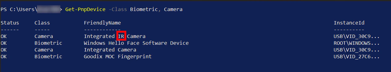 - Enter the code below to check for both fingerprint and facial recognition modules, as well as all viable camera devices